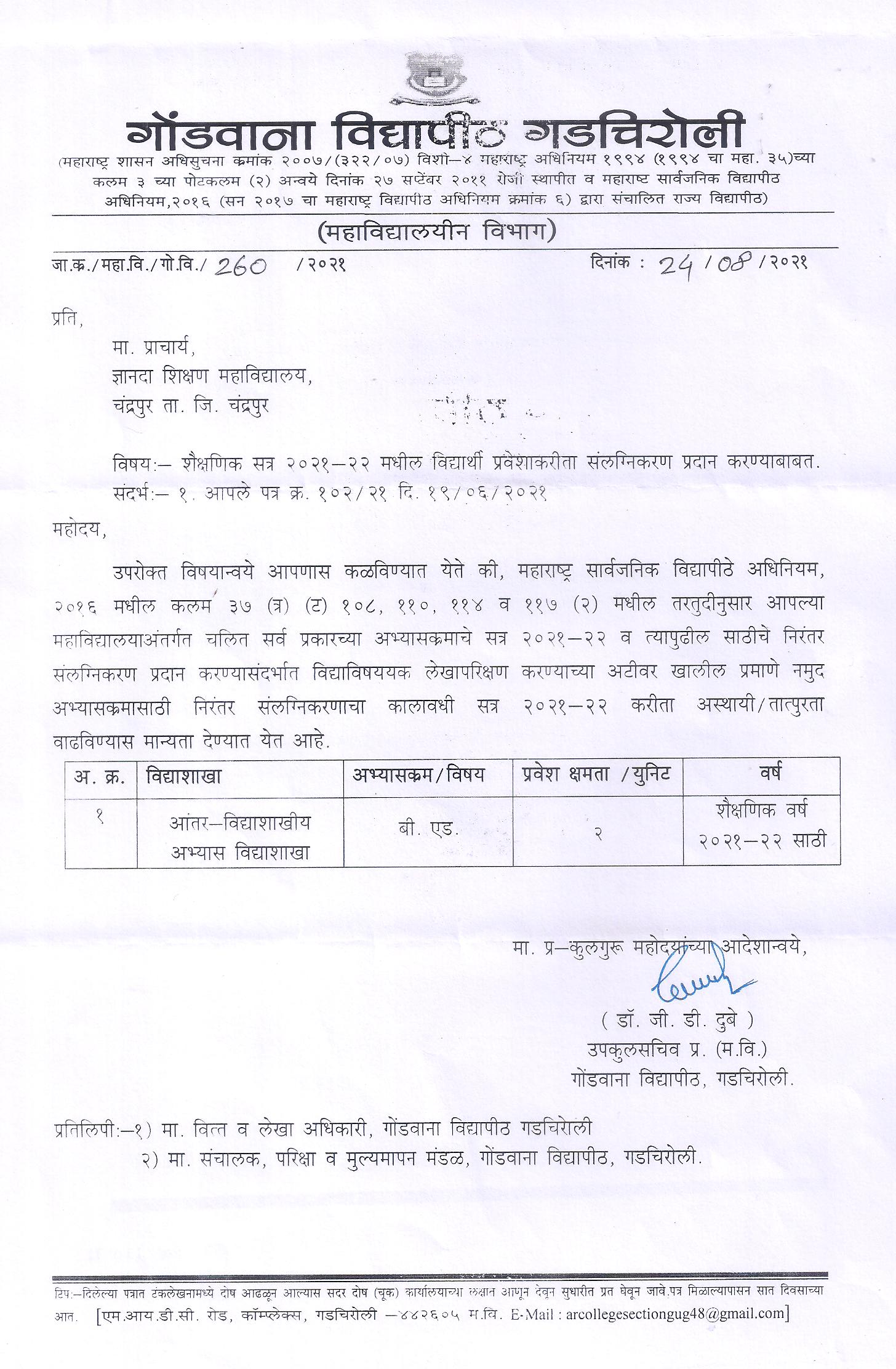 The college is recognized by National Council of Teacher Education (NCTE) WRC/APW0384/12346/2015, approved by Govt. of Maharashtra. The College is affiliated to Gondwana University, Gadchiroli.